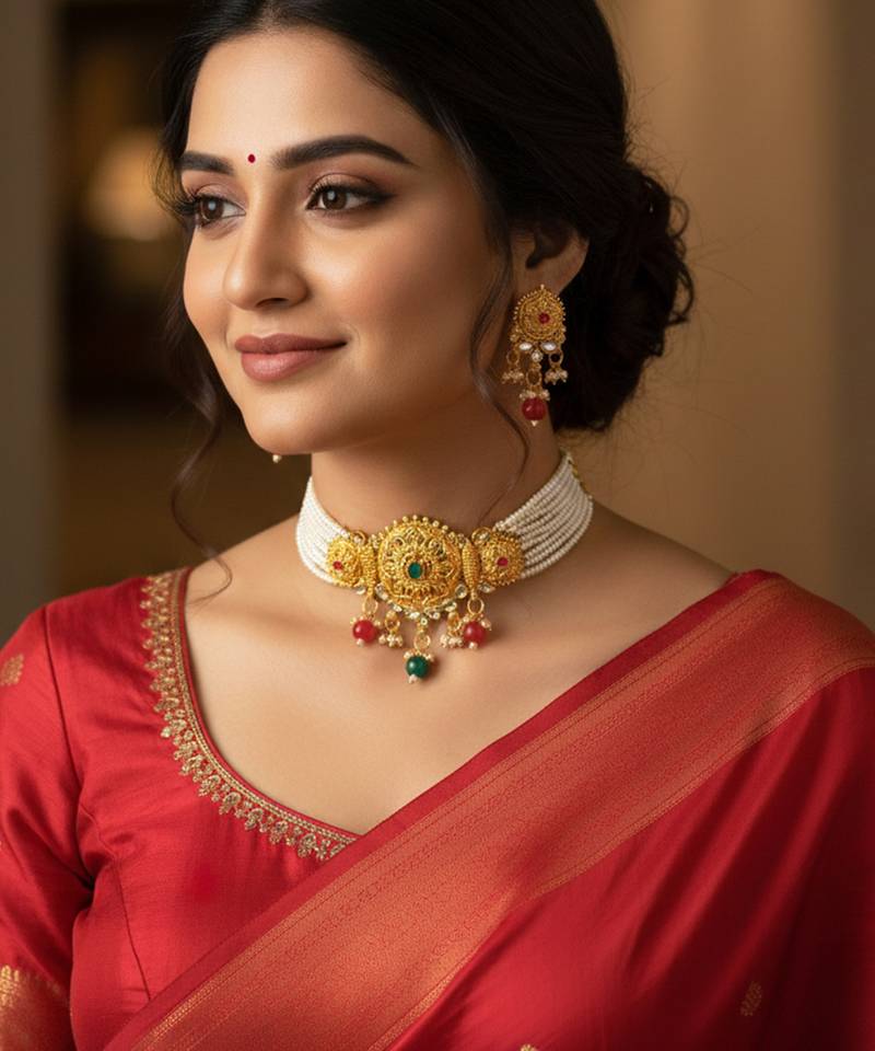Elevate your festive and formal look with this exquisite handmade choker necklace set from Bikaner, crafted with precision and cultural artistry. Designed in brass with micro gold plating, this set features intricate kundan work, imitation ruby beads, and multi-strand pearls that exude timeless elegance. The centerpiece necklace is paired with matching earrings, making it a perfect choice for engagements, weddings, parties, and traditional functions. The adjustable dori mechanism ensures a comfortable fit for all neck sizes, blending heritage craftsmanship with modern wearability. Celebrate tradition with jewelry that speaks of artistry, devotion, and sophistication.