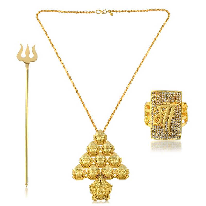 Brass Gold Plated Durga Ma Finger Ring, Trishul, Pendant Combo