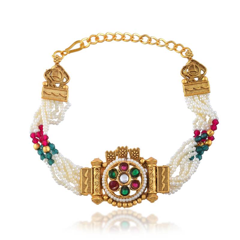 Immerse yourself in the timeless elegance of this traditional women's bracelet, meticulously handcrafted by skilled artisans in Jaipur. The brass base features a luxurious gold plating with stylish Pearl studded multi strand design that exudes traditional charm. The intricate Kundan Meenakari work showcases masterful traditional techniques, creating a stunning interplay of textures and patterns. The bracelet's centrepiece features a striking colouful kundan meenakari work, with Imitation ruby nd emerald stones in a geometric pattern. Beautiful green and red imitation stones adorn the sides, adding vibrant touches to the ornate design. The detailed lattice work and adjustable size chain-link construction ensure both durability and comfort. This versatile piece perfectly complements both traditional Indian attire and contemporary ensembles, making it an ideal choice for special occasions, festivals, or whenever you want to make a statement with your jewellery.