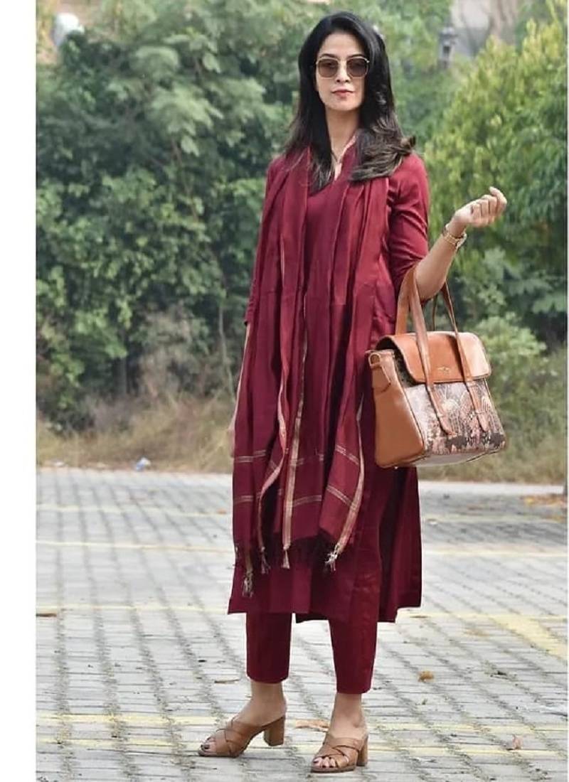 Maroon Cotton Solid Kurti With Pant And Dupatta Set