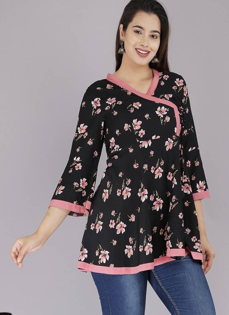 • Product Id : 4676780 • Package Details : 1 Top • Type : Short Kurtis • Fabric : Crepe • Work : Printed • Type : Floral Print • Sleeve : Quarter Sleeve • Color : Black • Stitching : Stitched Payments [+]
