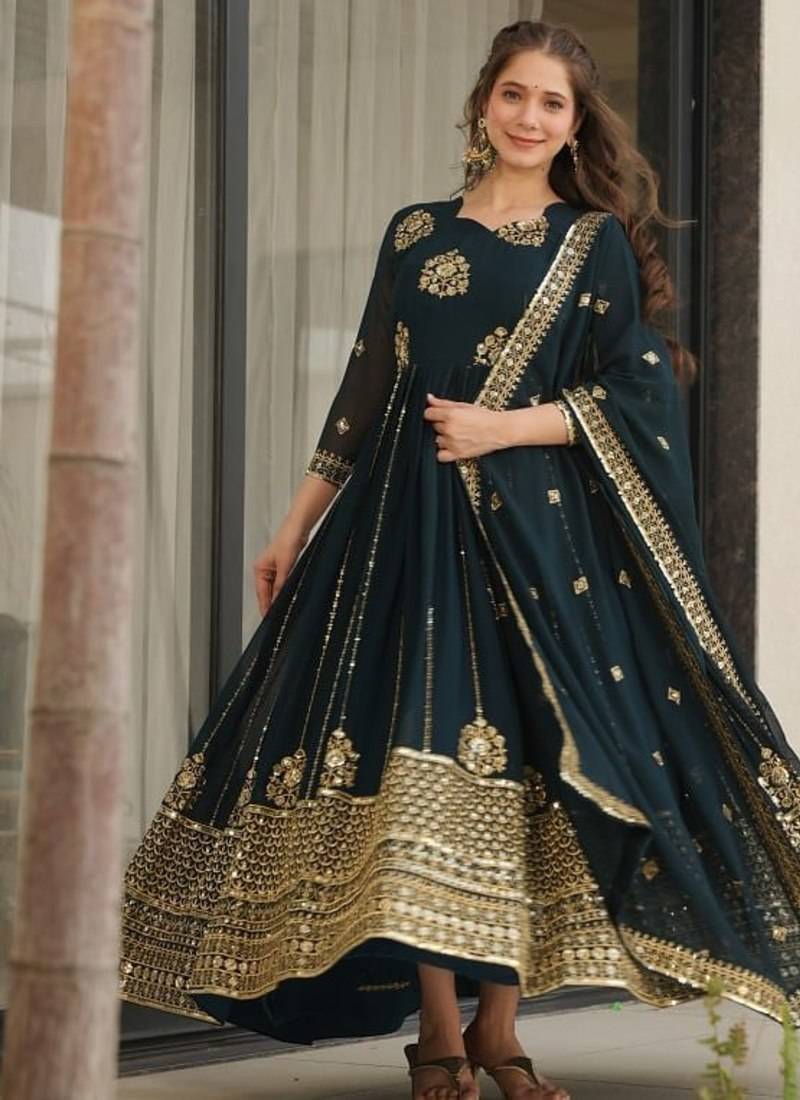 • Product Id : 4677646 • Package Details : 1 Top/1 Dupatta • Type : Anarkali Suit • Work : Embroidered • Type : Sequins Work • Look : Fashion • Sleeve : Full Sleeve • Neck Style : V Neck • Celebrity : Madhuri Dixit • Color : Teal • Fabric : Faux Georgette • Stitching : Stitched • Min Bustsize Fit : 38 • Max Bustsize Fit : 44 Payments [+]