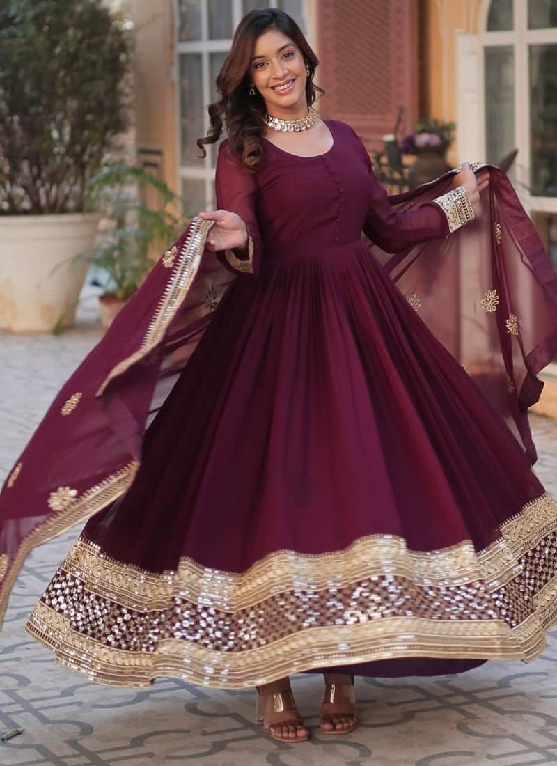 Maroon Sequins Embroidered Georgette Anarkali Kurta Set Stitched