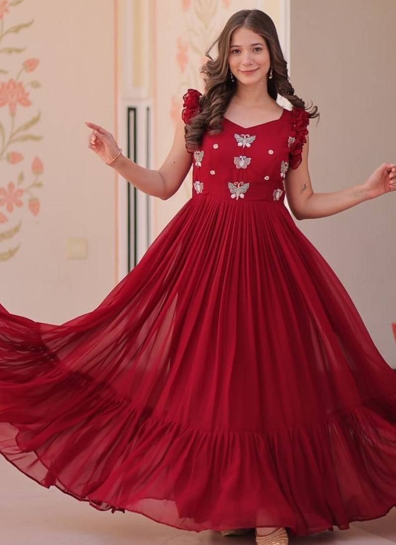 Red Faux Blooming Embroidered Work Gown Stitched