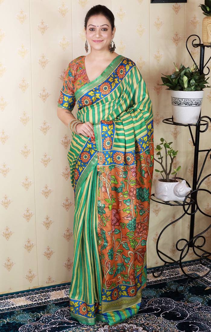 If you find the product for less we'll match it! Know MoreExperience refined elegance with this sophisticated Soft Tussar Silk saree, featuring graceful striped patterns across the body that showcase understated luxury. The saree is adorned with an ornate arrow zari woven border embellished with authentic Kalamkari prints on both edges, reflecting centuries of hand-painted textile artistry. The pallu showcases intricate Kalamkari floral designs that command attention with their detailed craftsmanship. Paired with a coordinating Kalamkari printed blouse, this saree effortlessly transitions from traditional gatherings to contemporary occasions, offering versatile sophistication for the discerning wearer.