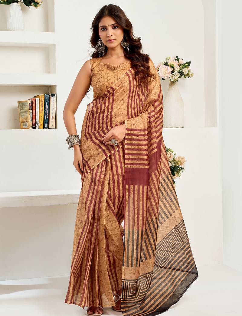 Caramel Linen Striped & Geomatric Printed Ready To Wear Saree