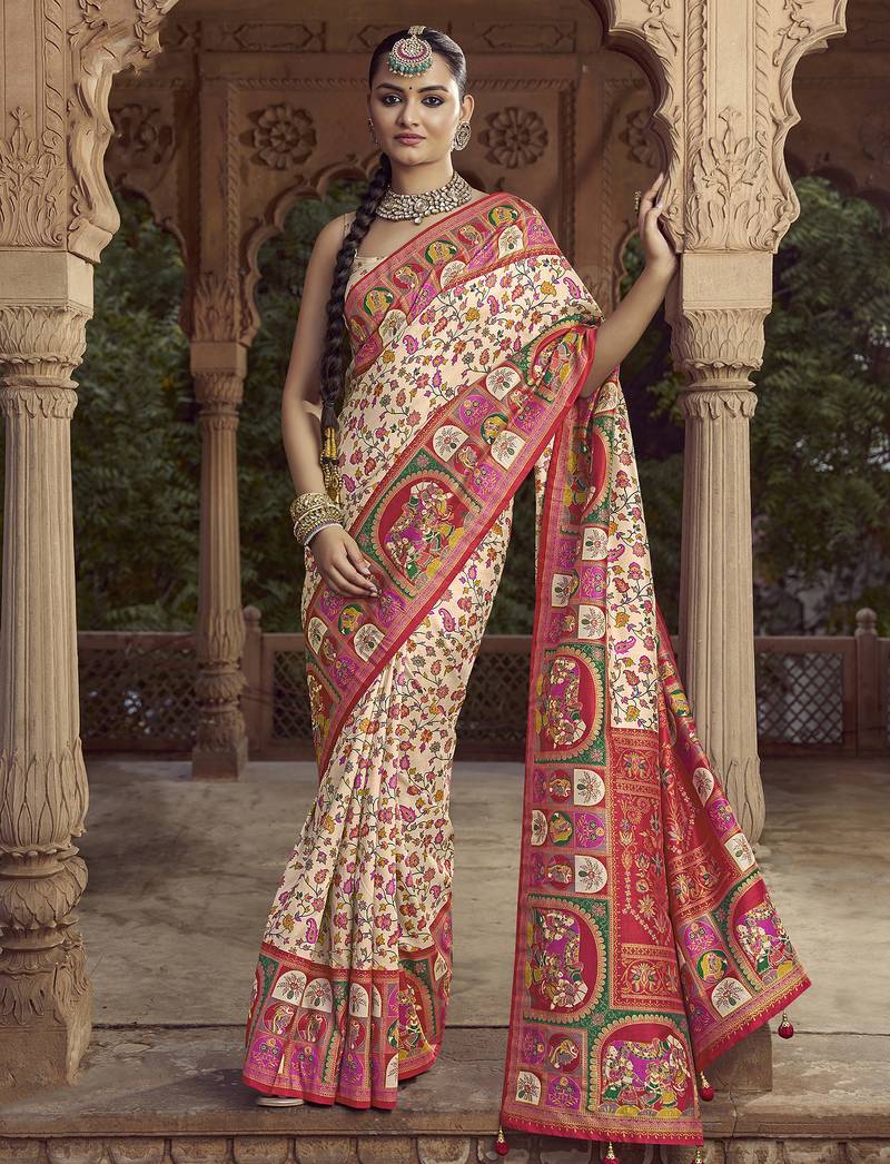 Cream Floral Zaal Print Patola Saree
