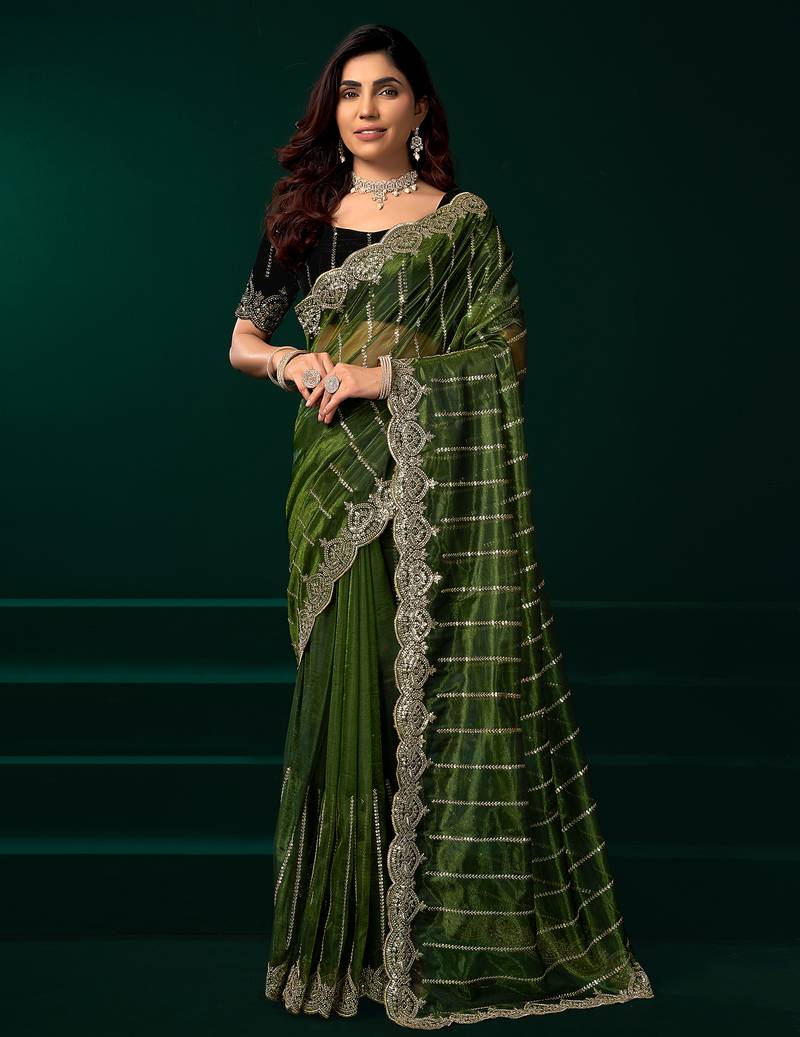 Green Net Shimmering Lines Sequence Embroidery Party Wear Saree