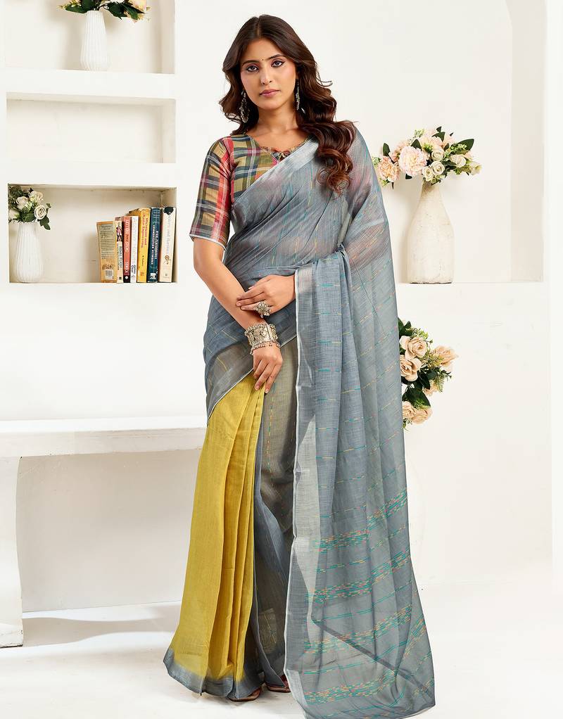 Style this grey linen beauty with statement earrings and sleek sandals for a polished ethnic look, or pair with delicate accessories for soft everyday grace. Ready to trend on fashion feeds and search results, this saree stands out as a bestseller‑worthy pick that’s as easy to wear as it is stunning to see. Add it to your collection for effortless charm and search‑friendly ethnic fashion that truly speaks styleSpecifications [-]