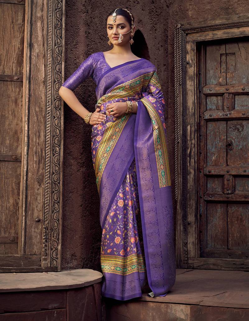 Lavender Jacquard P V Silk Blend Digital Floral Print Zari Weaving Bollywood Saree