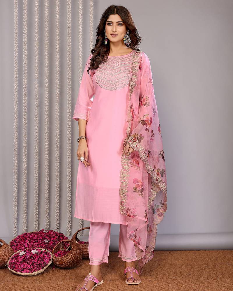 • Product Id : 4681488 • Package Details : 1 Top / 1 Bottom / 1 Dupatta • Type : Kurta Sets • Region : India • Fabric : Silk • Work : Embroidered • Type : Thread Work • Look : Fashion • Sleeve : Quarter Sleeve • Neck Style : Round Neck • Color : Light Pink • Stitching : Stitched Payments [+]