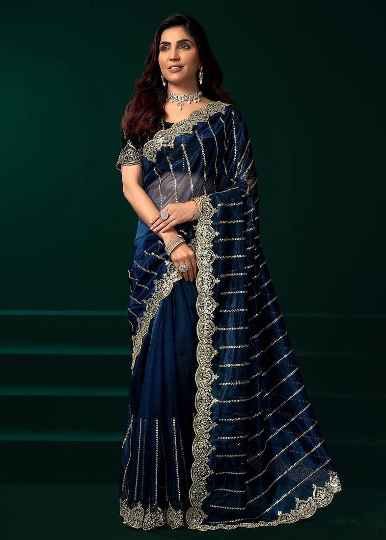 The deep navy blue color combined with shimmering lines adds sophistication and modern charm. Lightweight and flowing, this designer saree is ideal for weddings, receptions, and festive celebrations, ensuring comfort with style.