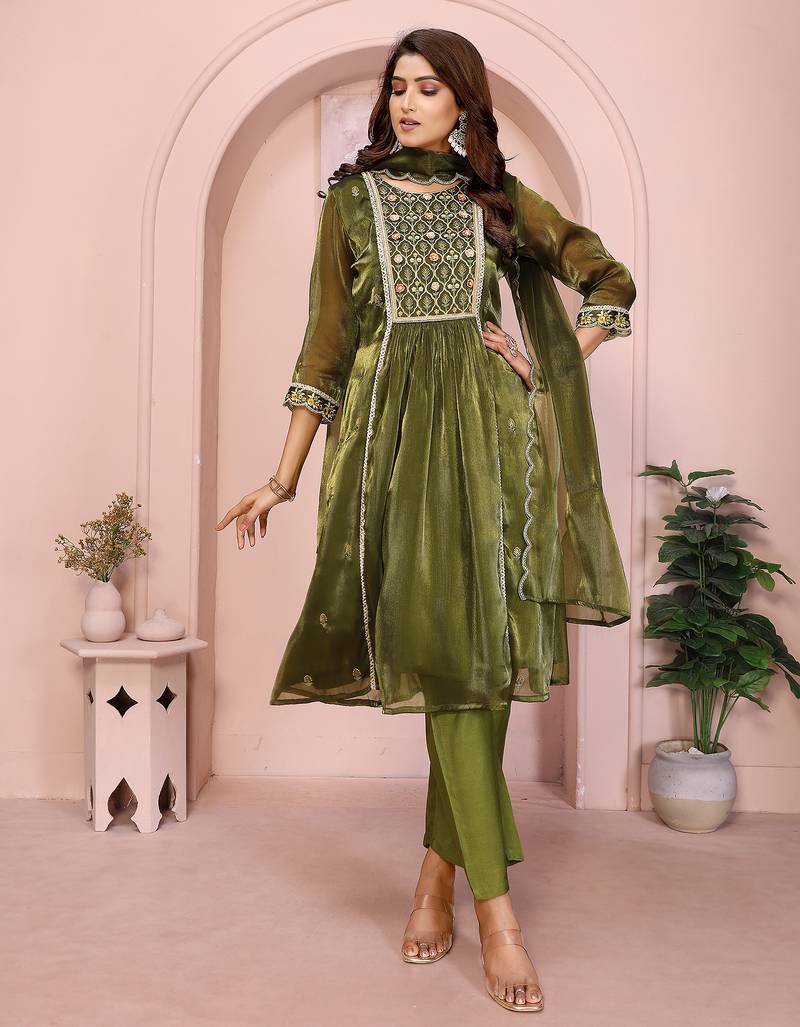 Olive Green Organza Yoke Embroidery A Line Round Neck Kurta Set