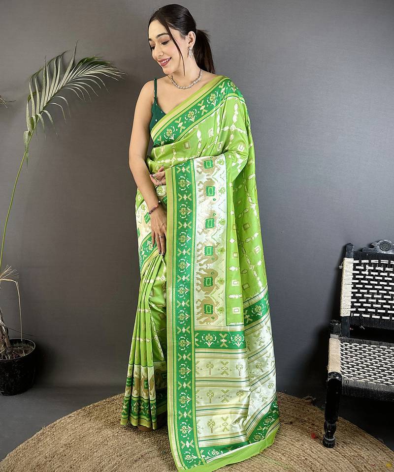 Drape yourself in fresh elegance with this Pear Green Woven Patola Silk Saree a dazzling blend of classic heritage and modern style. The vibrant pear green silk is richly adorned with intricate nature motifs and shimmering zari weaving, making it a top‑ranking pick in Women’s Ethnic Wear collections. Its lively hues and artful patterns elevate every festive celebration and wedding moment with joyful sparkle and timeless charm.