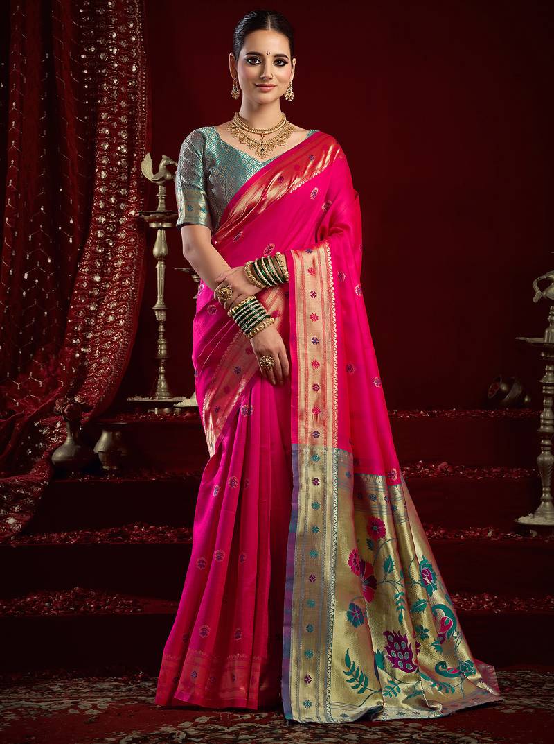 Designed for virality, the Pink Silk Blend Butti Paithani Saree is more than just an ethnic outfit it's a statement. Embrace the trending fashion wave and showcase your love for heritage while staying ahead of the curve. With its delicate detailing and rich texture, this saree is the ultimate addition to your wardrobe for those who want to look effortlessly chic. Make it yours today and experience the magic of a saree that’s as timeless as it is beautiful!• Saree : Color- Pink / Fabric- Silk Blend • Blouse : Color- Blue / Fabric- Silk Blend Saree Details