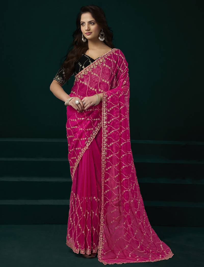 Rani Pink Net Jaal Pattern Sequence Embroidery Thread Work Party Wear Saree