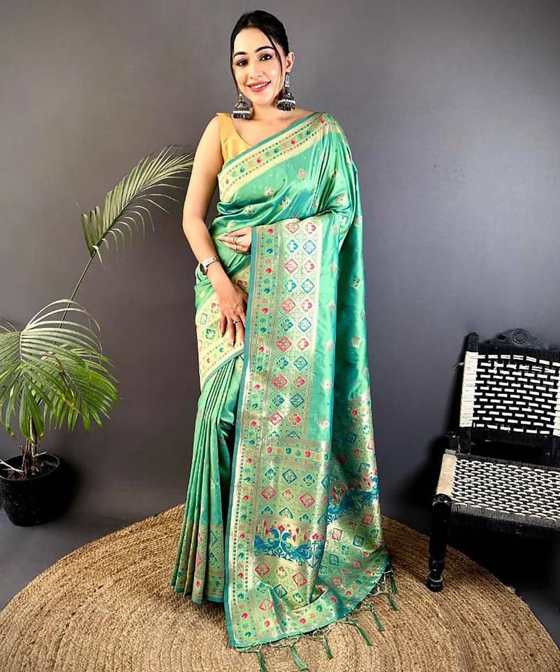 Sea Green Banarasi Lichi Silk Blend Meenakari Zari Weaving Patola Saree
