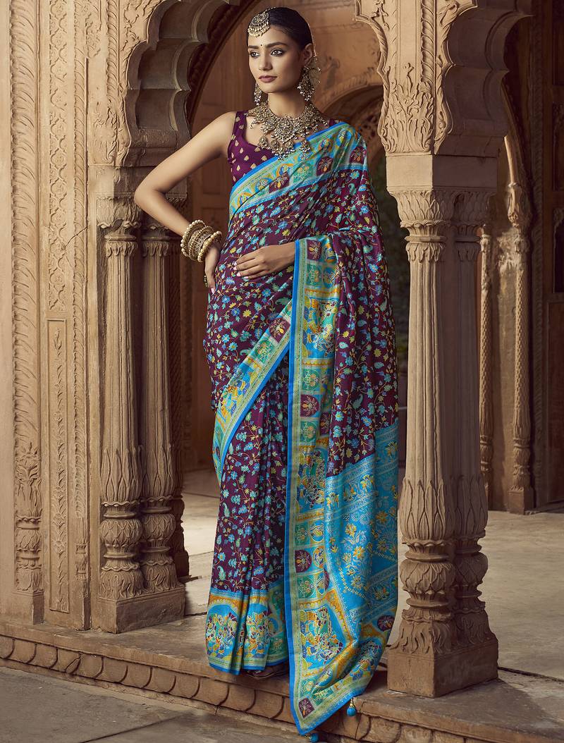 Wine Floral Zaal Print Patola Saree