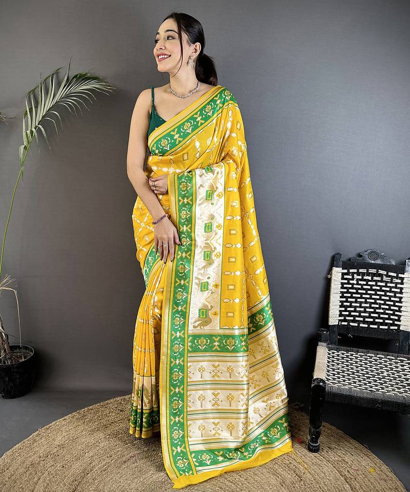 Yellow Banarasi Silk Blend Nature Motifs Zari Weaving Patola Saree