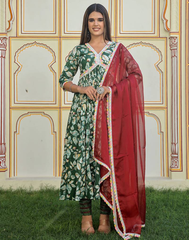 Green Printed Cotton Kurta Pant With Dupatta
