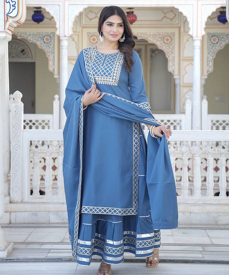 This traditional outfit is a light-Gray sharara suit set with silver Gota Patti & sequin work. The ensemble typically includes a straight-cut, flared sharara, and a matching dupatta. Product Details,Color: Light-Gray. Work/Embellishments: Features intricate silver detailing, which includes Gota Patti and Sequnce work (traditional silver or gold lace-like embroidery), sequins, and thread work.Style: An Indian ethnic wear set, perfect for festive occasions, weddings, or parties. Components: Usually a three-piece set comprising: Kurti: Calf-length top with a Round-neckline and three-quarter length sleeves, adorned with embroidery at the neckline and hem. Sharara: Flared Sharara that gather at the knees or lower leg, featuring the silver border detailing. Dupatta: matching Febric Dupatta with Embroidery Lace along the edges.