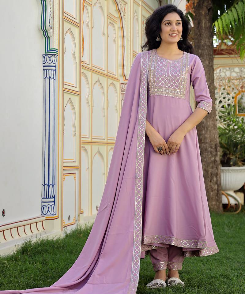It is a traditional Indian Anarkali style outfit, which includes a long, flowing kurta (top), coordinating pants, and a matching dupatta (scarf). Color: The primary color Light Pink. Details: The kurta features intricate geometric embroidery and sequin work around the neckline and bodice. The hemline of the kurta, the sleeves, the edge of the pants, and the borders of the dupatta are adorned with a distinctive gold lace border with a criss-cross pattern. Material: The fabric is often described as a heavy rayon or geo gette blend, known for its soft drape and comfort. Occasion: This type of outfit is c nsidered suitable for festive occasions, parties, and weddings.