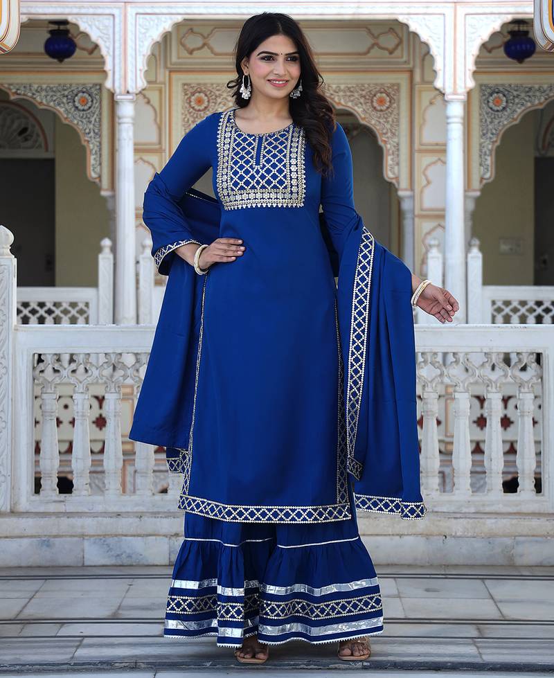 This traditional outfit is a T.Blue sharara suit set with silver Gota Patti & sequin work. The ensemble typically includes a straight-cut, flared sharara, and a matching dupatta. Product Details,Color: T.Blue. Work/Embellishments: Features intricate silver detailing, which includes Gota Patti and Sequnce work (traditional silver or gold lace-like embroidery), sequins, and thread work.Style: An Indian ethnic wear set, perfect for festive occasions, weddings, or parties. Components: Usually a three-piece set comprising: Kurti: Calf-length top with a Round-neckline and three-quarter length sleeves, adorned with embroidery at the neckline and hem. Sharara: Flared Sharara that gather at the knees or lower leg, featuring the silver border detailing. Dupatta: matching Febric Dupatta with Embroidery Lace along the edges.
