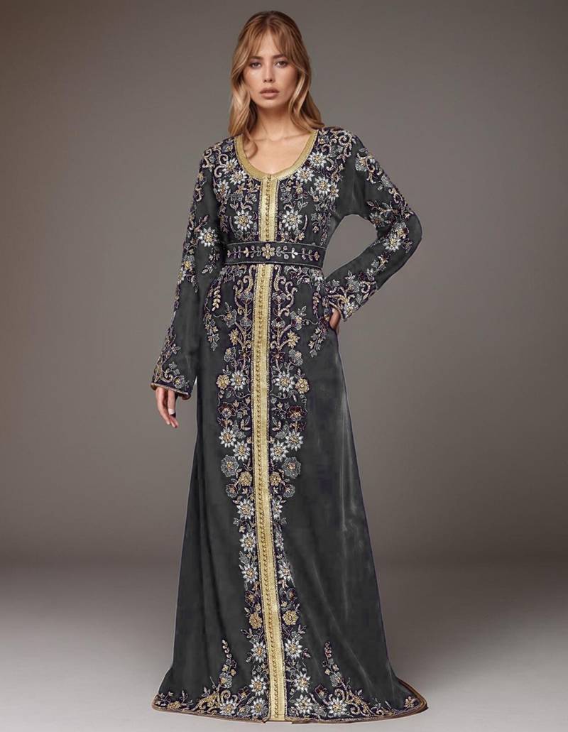 Luxury Grey color full sleeves Moroccan Kaftan, this luxurious design that's sure to turn heads, this kaftan dress flows over curves and boasts an ornate embellished design with Golden & Silver beads, and beautiful crystal stones.