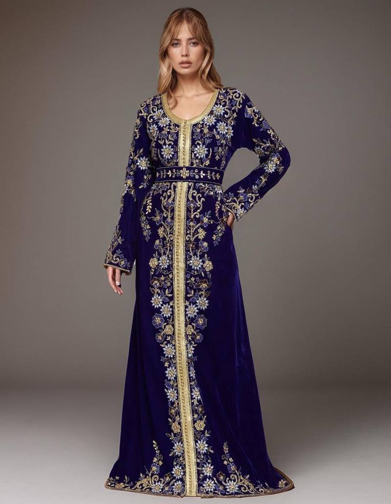 Luxury Navy blue color full sleeves Moroccan Kaftan, this luxurious design that's sure to turn heads, this kaftan dress flows over curves and boasts an ornate embellished design with Golden & Silver beads, and beautiful crystal stones.