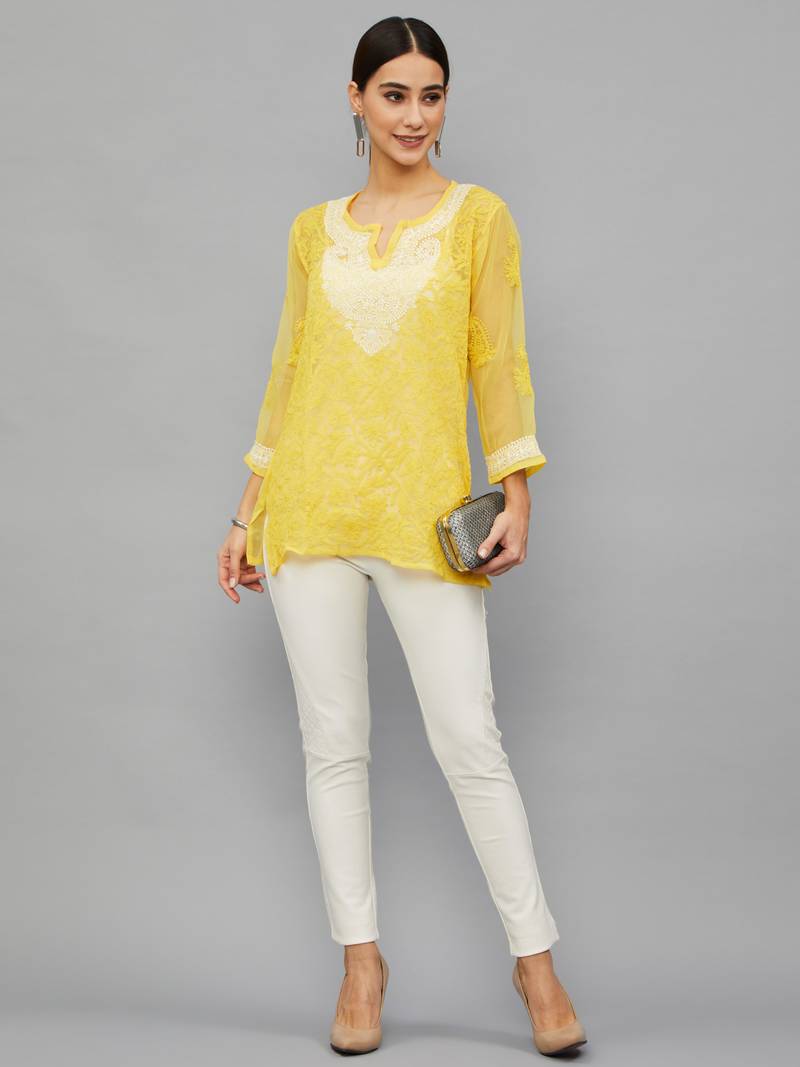 This Yellow Kurti Top Is Made Of Georgette Fabric. The Lightweight Quality Of The Georgette Material Makes It Simple To Carry And Maintain. This Georgette Kurta Is Accompanied By A Slip. Because Of Its Light Fabric And Skin Friendly Cotton Threads Used For Embroidery, The Short Chikan Kurta Top Provides Maximum Comfort.