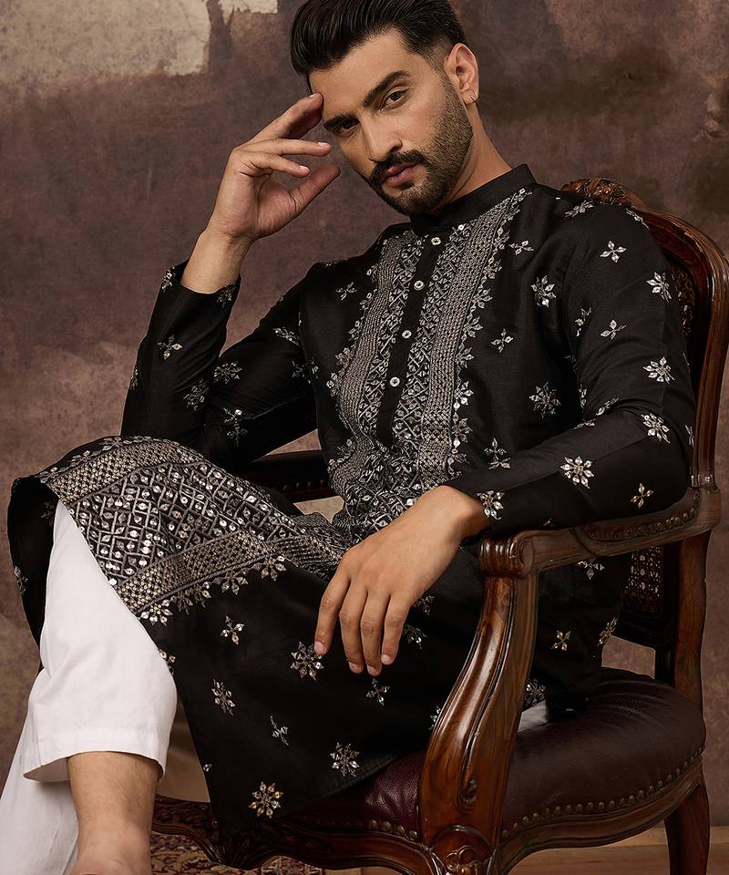 • Product Id : 4728905 • Package Details : 1 Kurta • Type : Kurta • Region : India • Work : Embroidered • Look : Traditional • Sleeve : Full Sleeve • Neck Style : Band Collar Neck Kameez • Color : Black • Top Color : Black • Top Fabric : Silk Blend • Fabric : Silk Blend • Stitching : Stitched Payments [+]