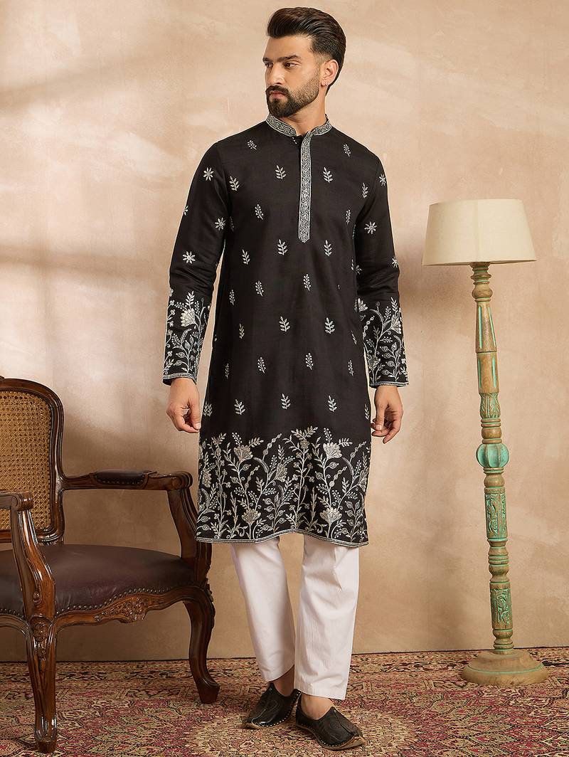 Men Black Silk Blend Solid Embroidered Straight Kurta Sets