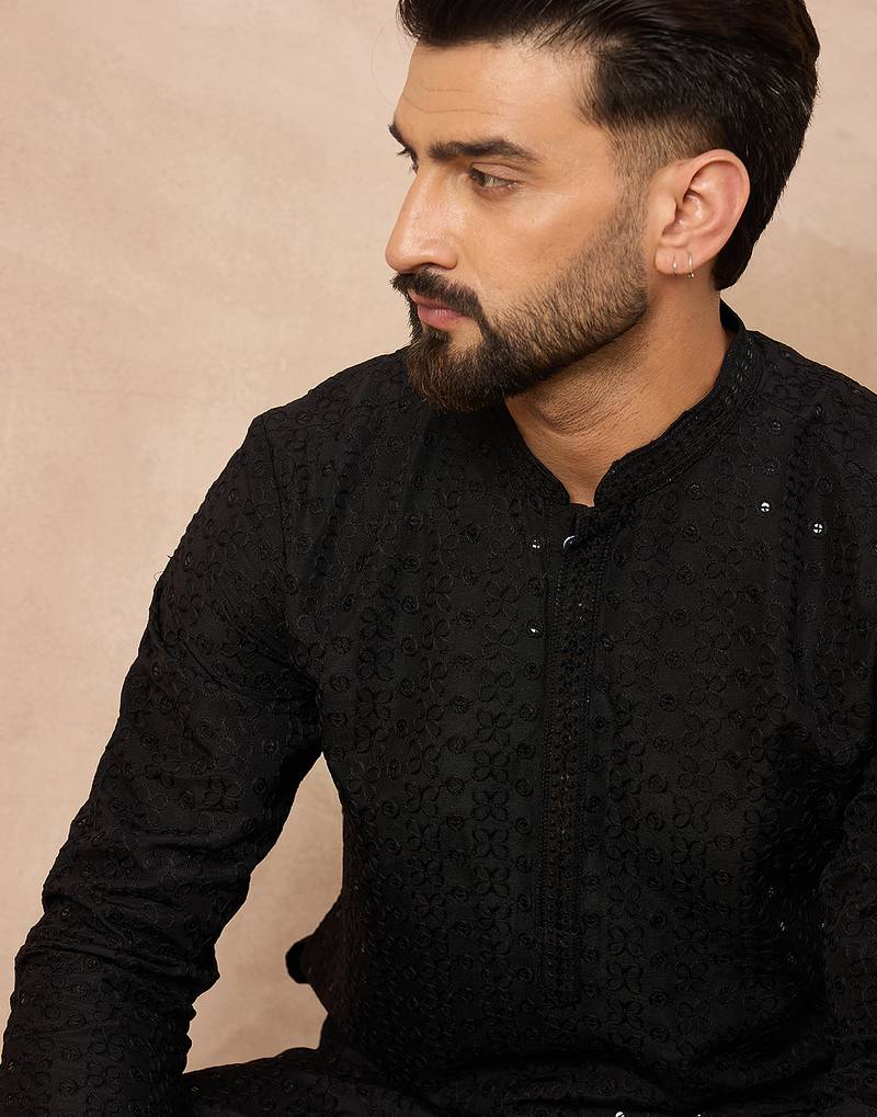 Men Black Viscose Rayon Solid Embroidered Straight Kurta