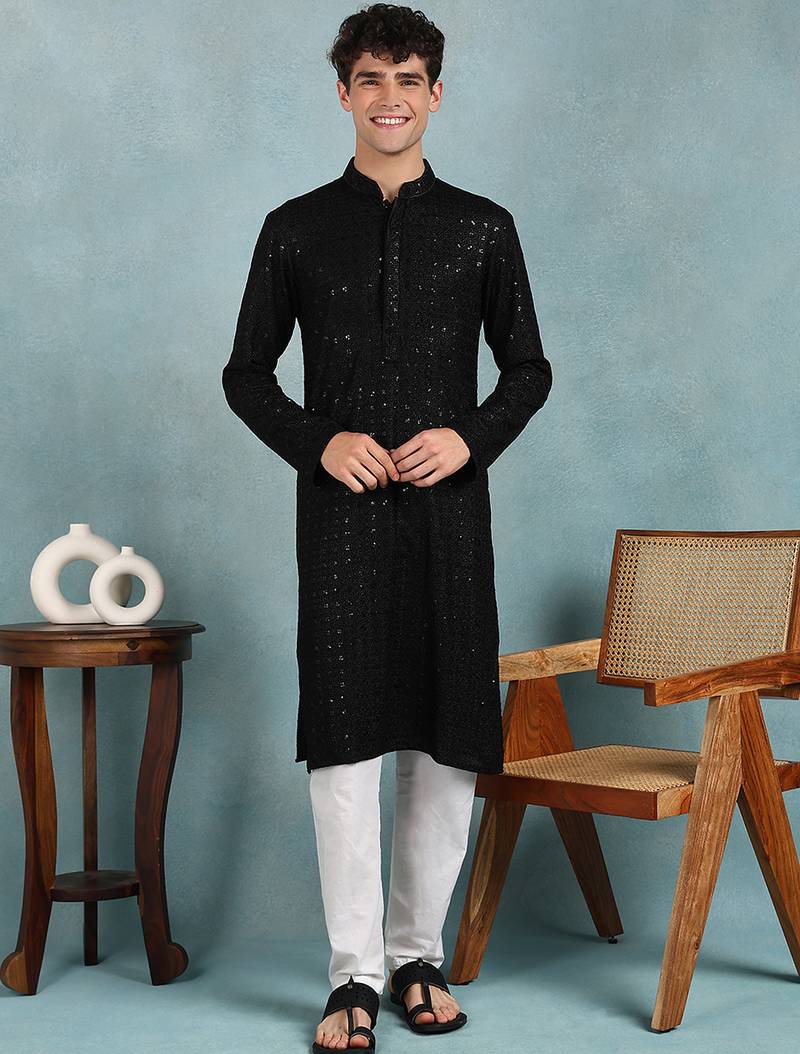 Men Black Viscose Rayon Solid Embroidered Straight Kurta