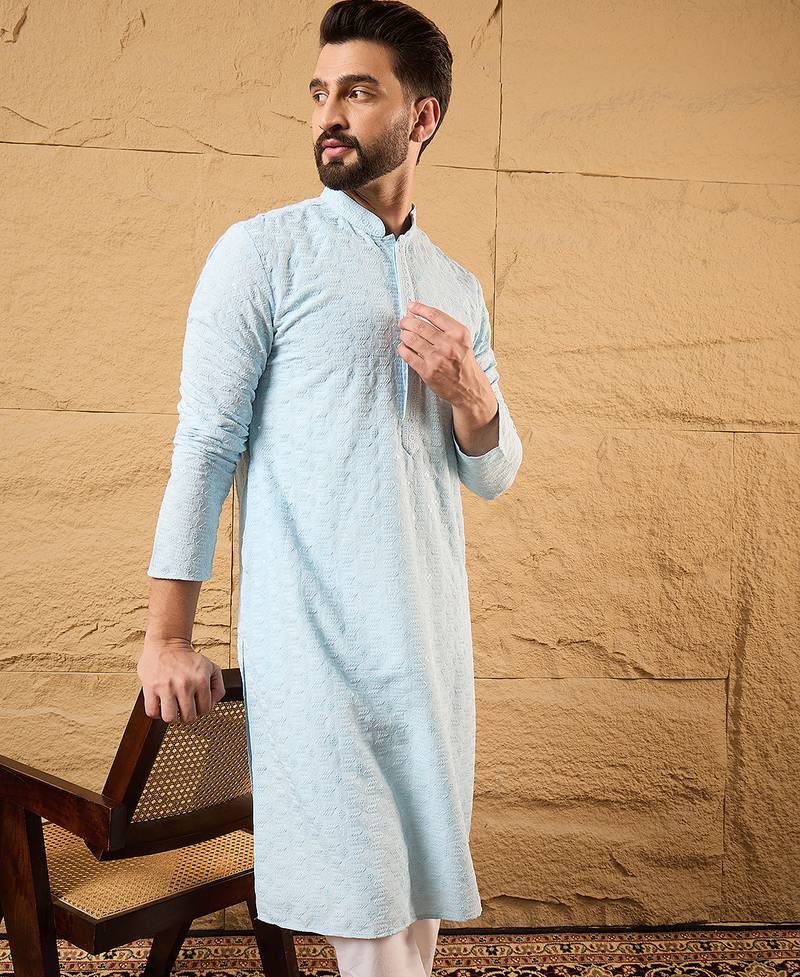 Men Blue Rayon Blend Solid Embroidered Straight Kurta