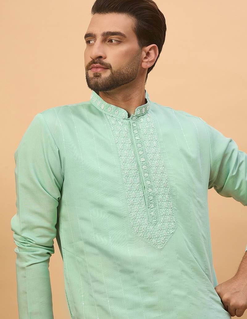 Men Blue Silk Blend Solid Embroidered Straight Kurta