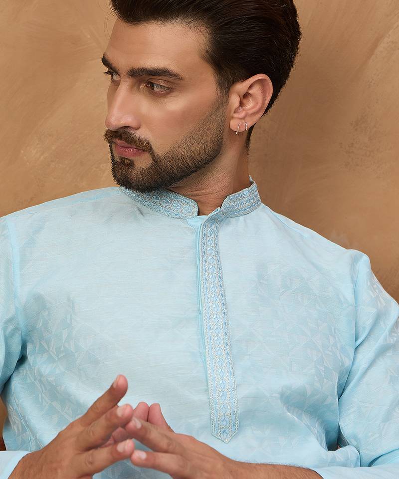 Men Blue Silk Blend Solid Embroidered Straight Kurta