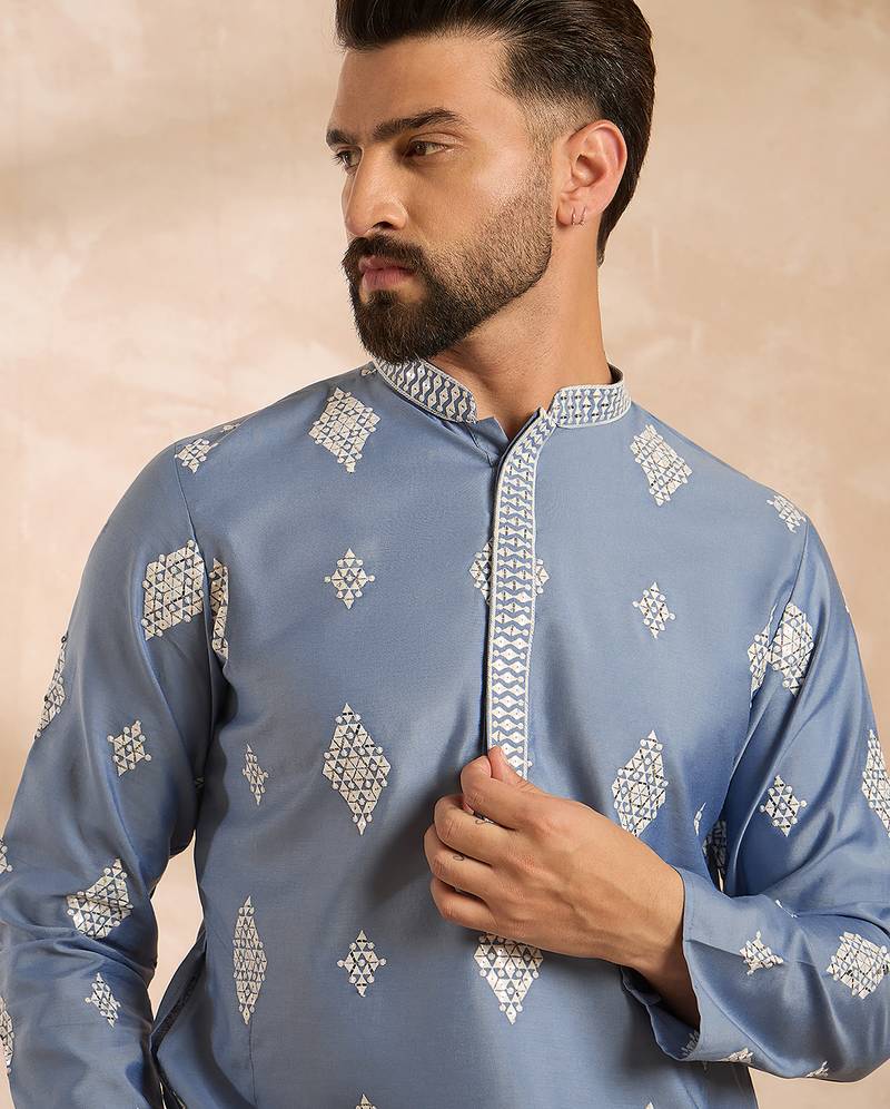 Men Blue Silk Blend Solid Embroidered Straight Kurta Sets