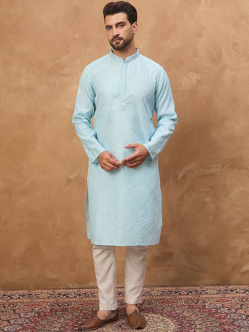 Men Blue Silk Blend Solid Embroidered Straight Kurta With Pant Set
