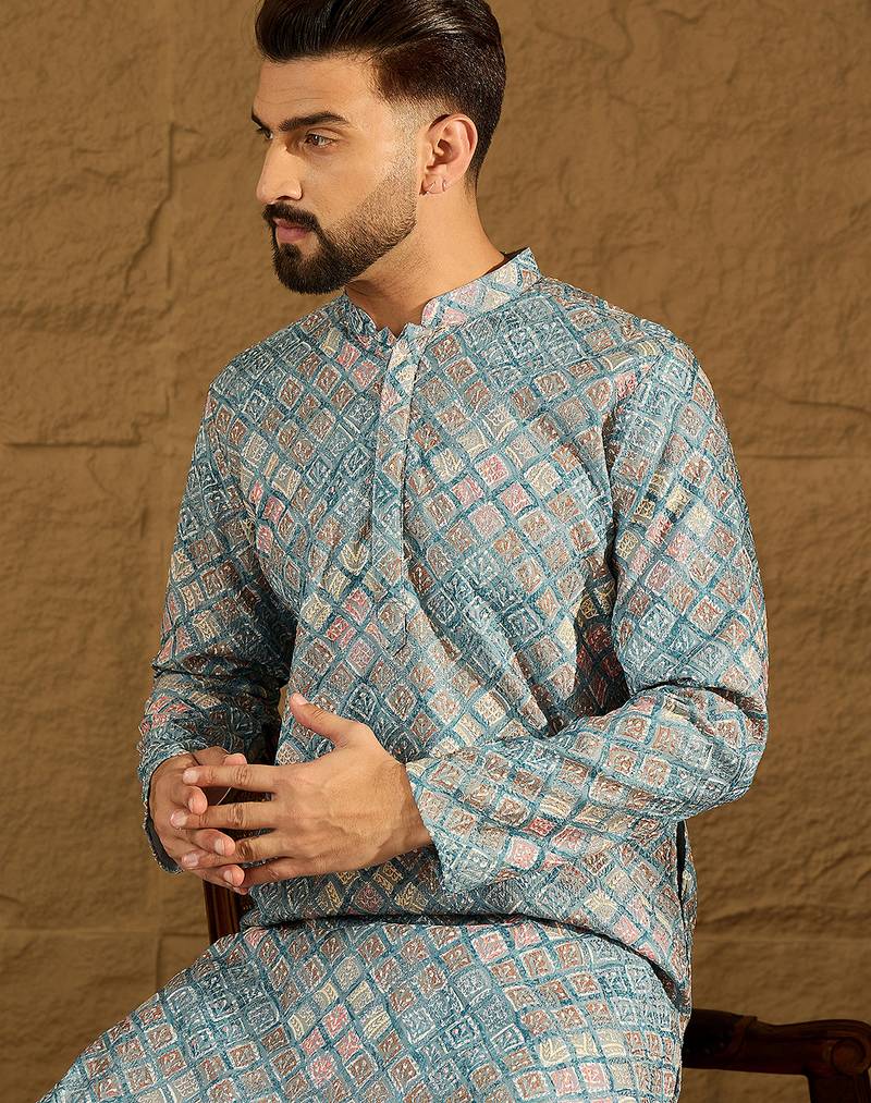 Men Blue Viscose Rayon Abstract Embroidered Straight Kurta