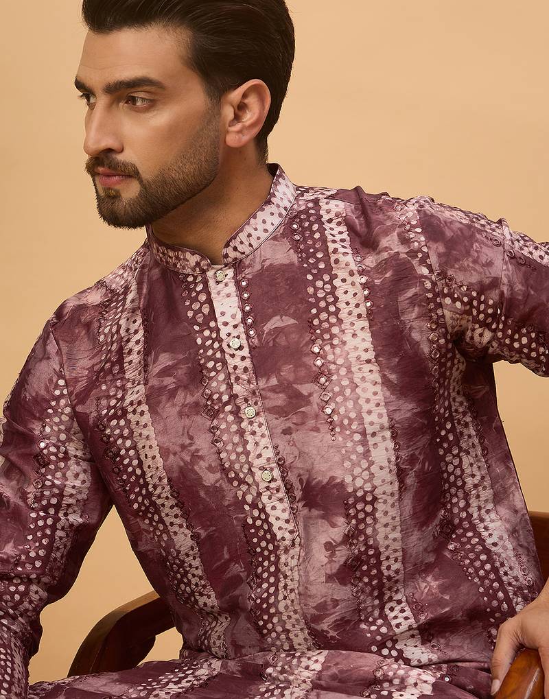 Men Burgundy Silk Blend Shibori Embroidered Straight Kurta