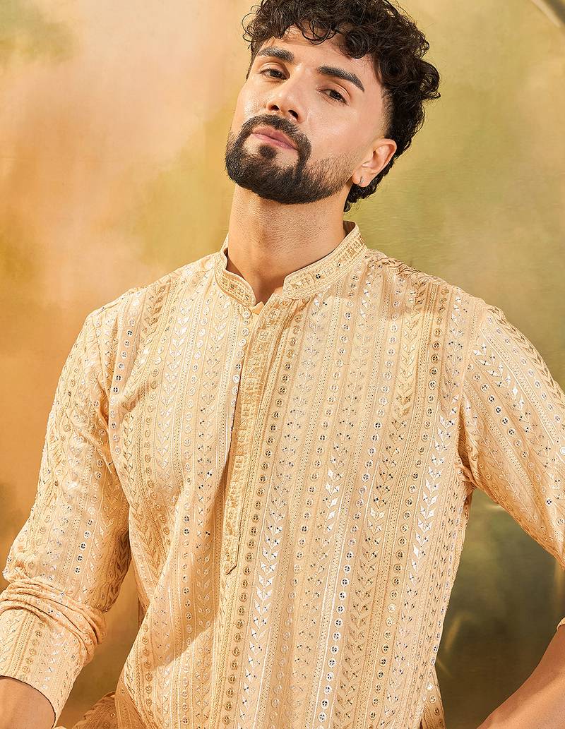 Men Cream Viscose Rayon Solid Embroidered Straight Kurta