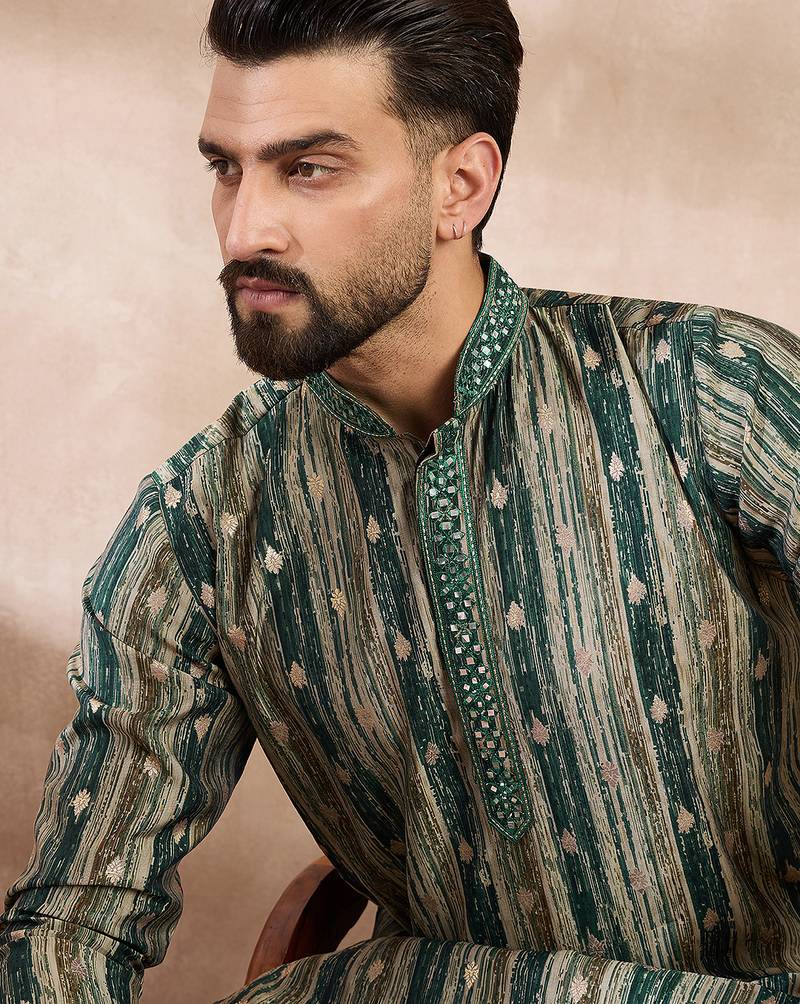 • Product Id : 4728468 • Package Details : 1 Kurta / 1 Trouser • Type : Kurta Pajama • Region : India • Work : Printed • Look : Traditional • Bottom Style : Trouser • Sleeve : Full Sleeve • Neck Style : Band Collar Neck Kameez • Color : Green • Top Color : Green • Top Fabric : Silk Blend • Fabric : Silk Blend • Stitching : Stitched Payments [+]