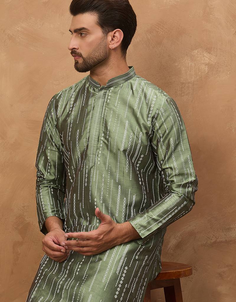 • Product Id : 4729013 • Package Details : 1 Kurta • Type : Kurta • Region : India • Work : Embroidered • Look : Traditional • Sleeve : Full Sleeve • Neck Style : Band Collar Neck Kameez • Color : Green • Top Color : Green • Top Fabric : Silk Blend • Fabric : Silk Blend • Stitching : Stitched Payments [+]