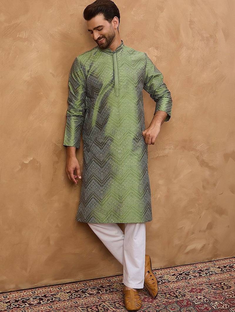 • Product Id : 4728226 • Package Details : 1 Kurta / 1 Trouser • Type : Kurta Pajama • Region : India • Work : Printed • Look : Traditional • Bottom Style : Trouser • Sleeve : Full Sleeve • Neck Style : Band Collar Neck Kameez • Color : Green • Top Color : Green • Top Fabric : Silk Blend • Fabric : Silk Blend • Stitching : Stitched Payments [+]