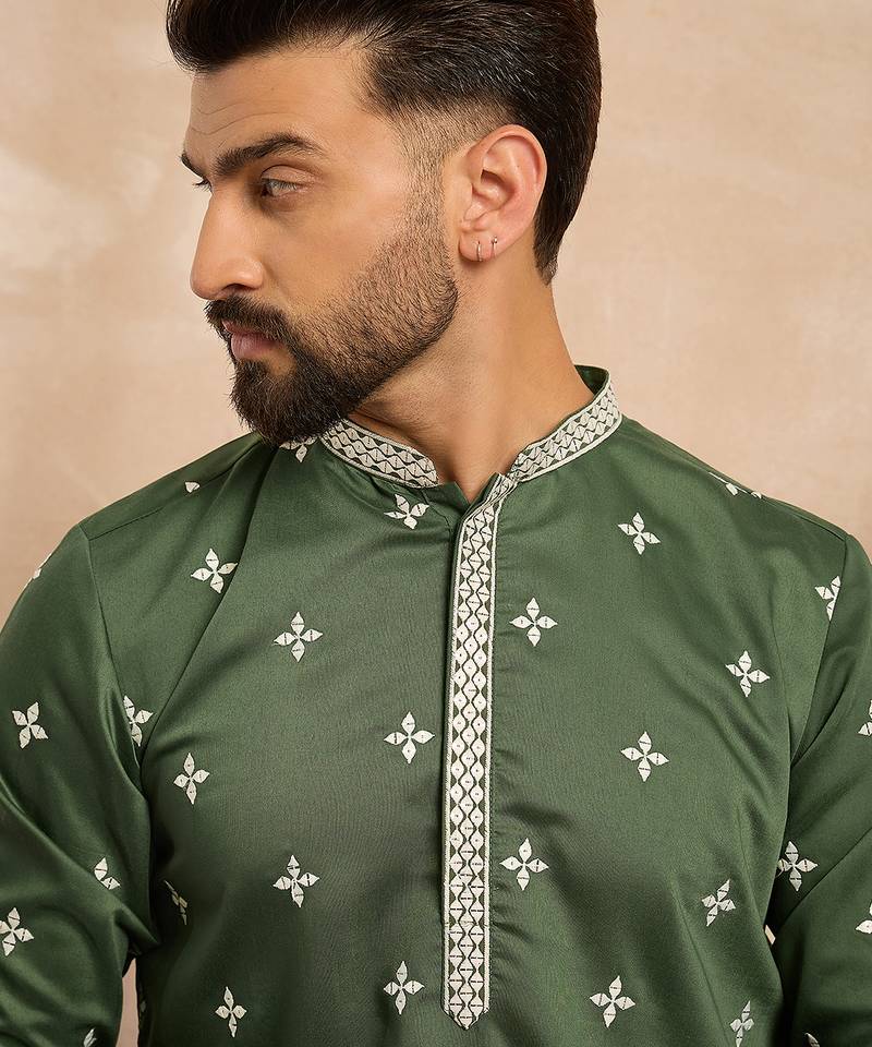 Men Green Silk Blend Solid Embroidered Straight Kurta Sets