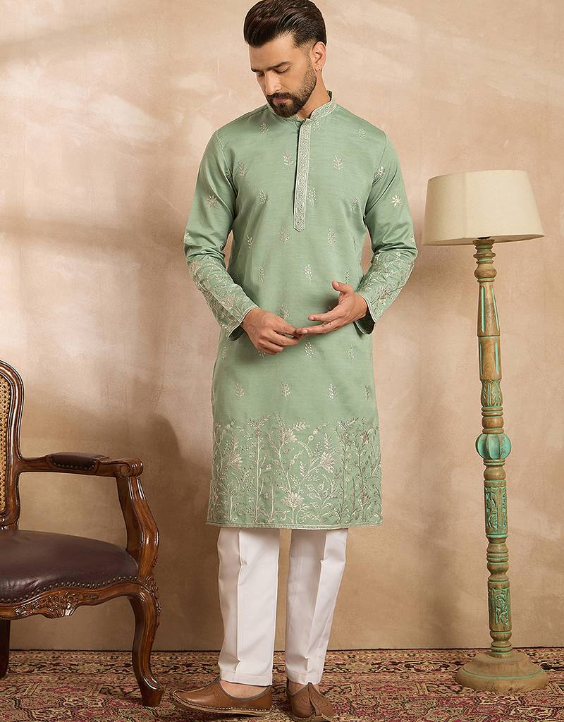 • Product Id : 4728354 • Package Details : 1 Kurta / 1 Trouser • Type : Kurta Pajama • Region : India • Work : Embroidered • Look : Traditional • Bottom Style : Trouser • Sleeve : Full Sleeve • Neck Style : Band Collar Neck Kameez • Color : Green • Top Color : Green • Top Fabric : Silk Blend • Fabric : Silk Blend • Stitching : Stitched Payments [+]