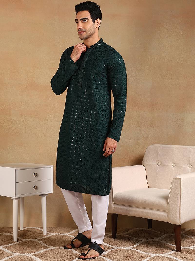 Men Green Viscose Rayon Solid Embroidered Straight Kurta