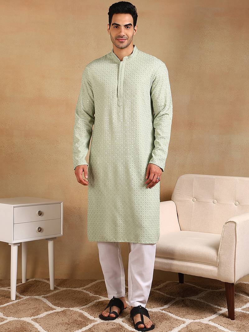 Men Green Viscose Rayon Solid Embroidered Straight Kurta