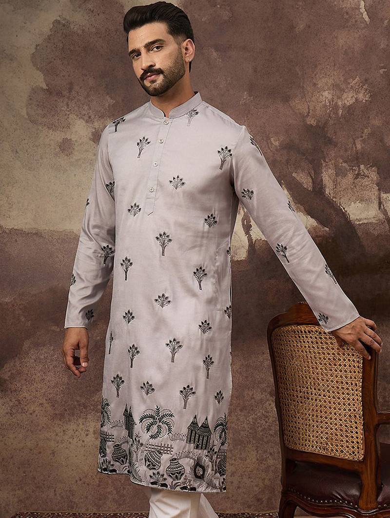 Men Grey Silk Blend Solid Embroidered Straight Kurta And Trouser
